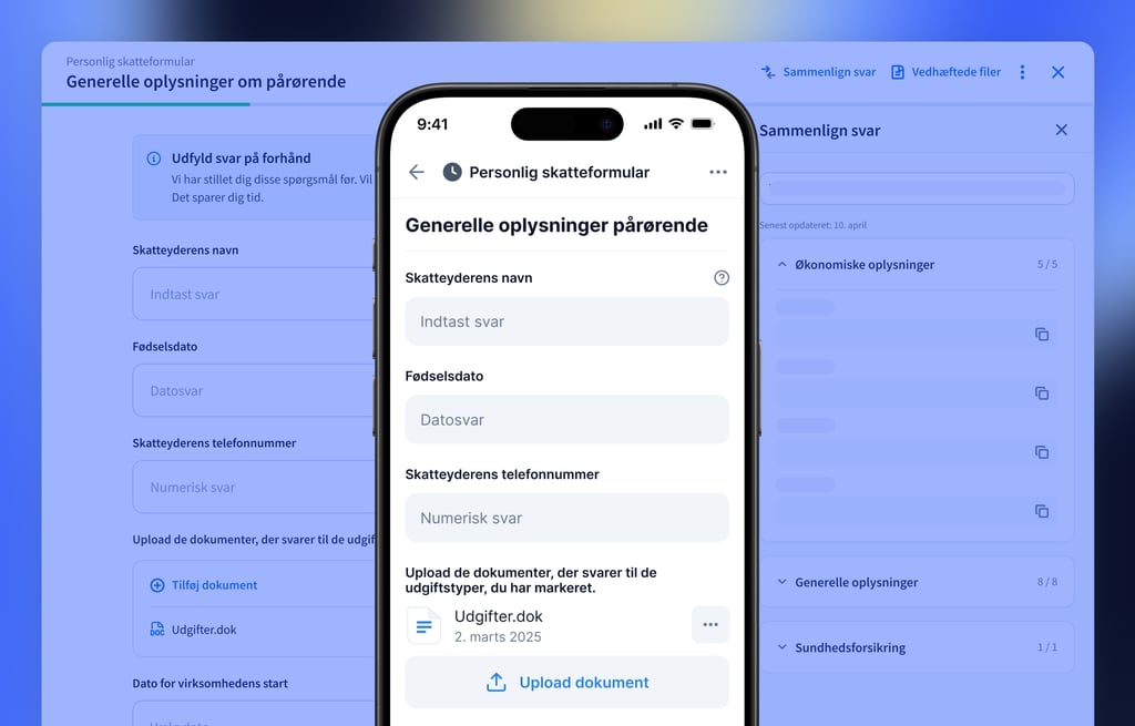 De bedste formularer er dem, som klienterne udfylder. TaxDomes formularer giver en gnidningsfri oplevelse — svar gemmes automatisk, formularer fungerer på alle enheder, påmindelser er automatiserede, og gentagende klienter behøver ikke at indtaste data igen.