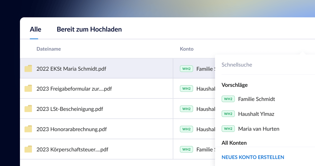 Wählen Sie die Mandanten aus, für die Sie Dokumente hochladen möchten, verknüpfen Sie die Dateien mit bestimmten Aufgaben und laden Sie mühelos mehrere Dokumente und Ordner gleichzeitig in verschiedene Konten hoch.