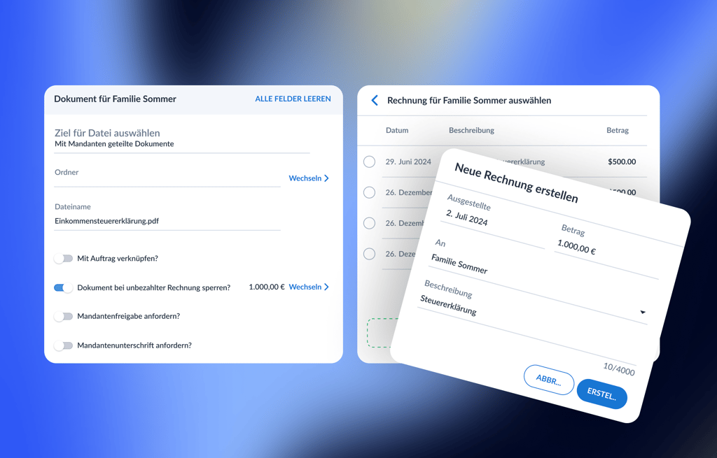 Reduzieren Sie offene Forderungen mit der Funktion „Gesperrt bis zur Rechnungszahlung“: Der Mandant wird über die Fertigstellung der Steuererklärung informiert, kann sie jedoch erst nach erfolgreicher Zahlung einsehen oder herunterladen.