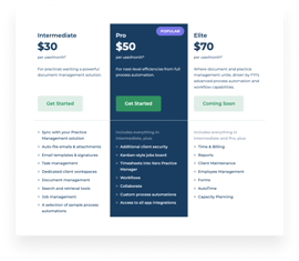 The intermediate package syncs with your practice management solution and offers document and task management, while the pro subscription offers additional client security and process automation.
