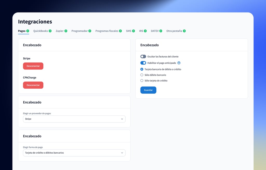 Todos los puntos de contacto de tu empresa en un portal integrado: tus clientes pueden enviar documentos, chatear con tu equipo, pagar facturas y más.