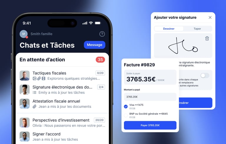 Grâce à l’application mobile, vos clients peuvent interagir facilement avec votre cabinet, comme ils le feraient habituellement via le portail client en ligne. Ils peuvent accéder aux documents, les consulter et les signer électroniquement, payer des factures, envoyer des messages sécurisés, et bien plus encore — où qu’ils soient.