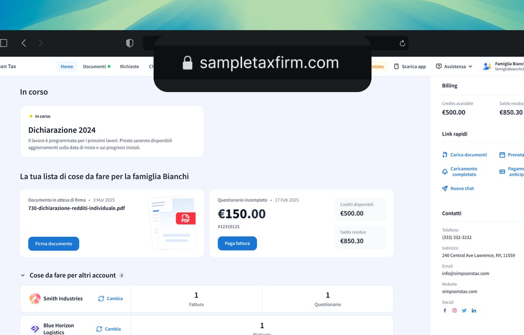 La nostra missione è offrire un’esperienza semplice e intuitiva, centralizzando tutte le interazioni con il tuo studio in un unico hub.