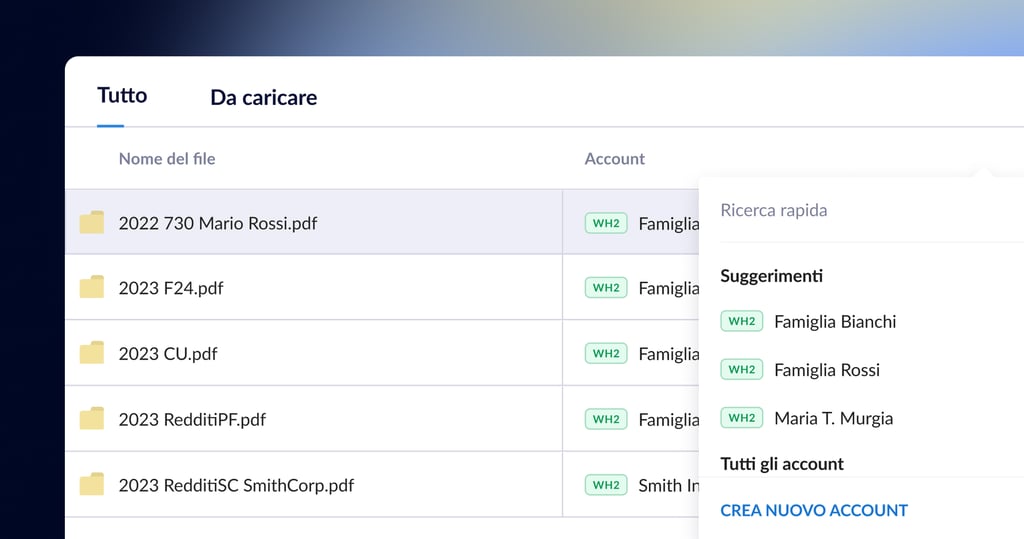 Seleziona i clienti per cui desideri caricare i documenti, collega i file a task specifici e carica facilmente più documenti e cartelle su diversi account contemporaneamente.