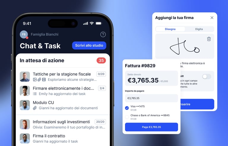 Con l’app mobile, i tuoi clienti possono interagire comodamente con il tuo studio proprio come farebbero dal portale web. Possono accedere ai documenti, consultarli, firmarli digitalmente, pagare fatture, inviare messaggi sicuri e molto altro – ovunque si trovino.