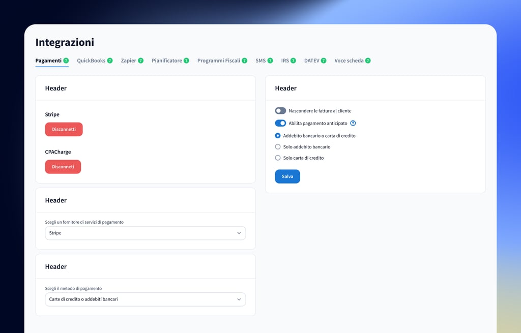 Tutti i punti di contatto del tuo studio in un unico portale: i clienti possono inviare documenti, chattare con il tuo team, pagare le fatture e molto altro.