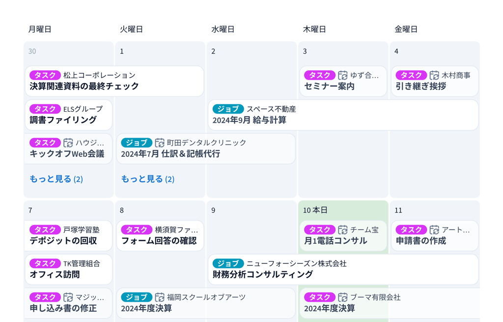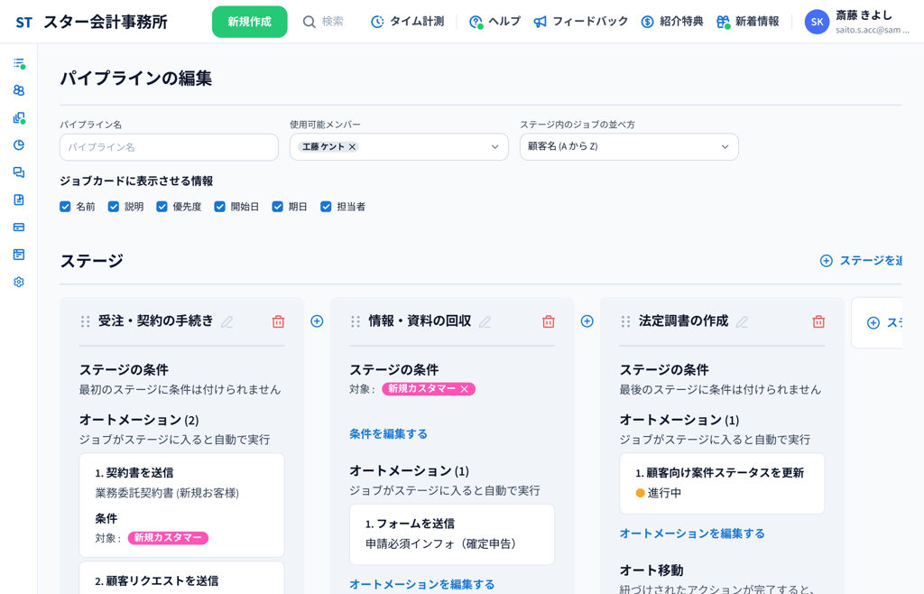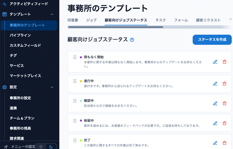 事務所内タスク、顧客とのチャット&メール、請求書・契約書の送付、サービスごとのワークフロー等、業務において発生する様々な要素を、テンプレートを駆使して自動化できます