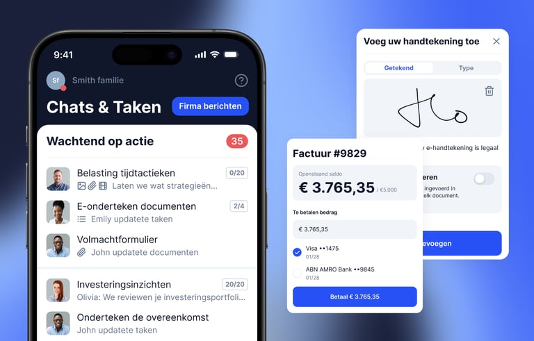 Van het verwerken van elektronische handtekeningen en beveiligde berichten tot het accepteren van offertes en nog veel meer: dankzij de intuïtieve interface en het overzichtelijke dashboard blijven uw klanten goed geïnformeerd en hebben zij moeiteloos toegang tot de informatie die zij nodig hebben.