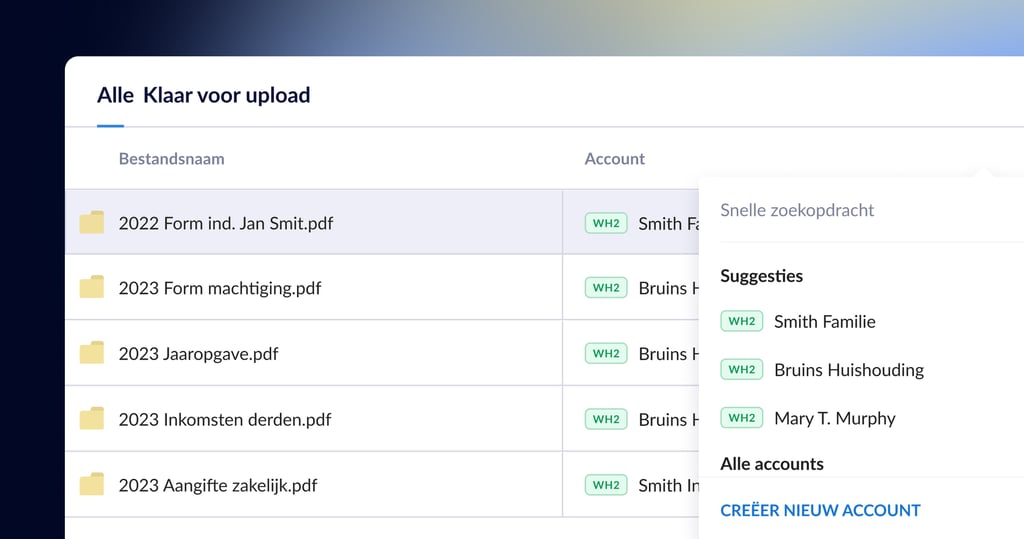 Selecteer de klanten waarvoor u documenten wilt uploaden, koppel de documenten aan specifieke taken en upload eenvoudig meerdere documenten en mappen tegelijk naar verschillende accounts.