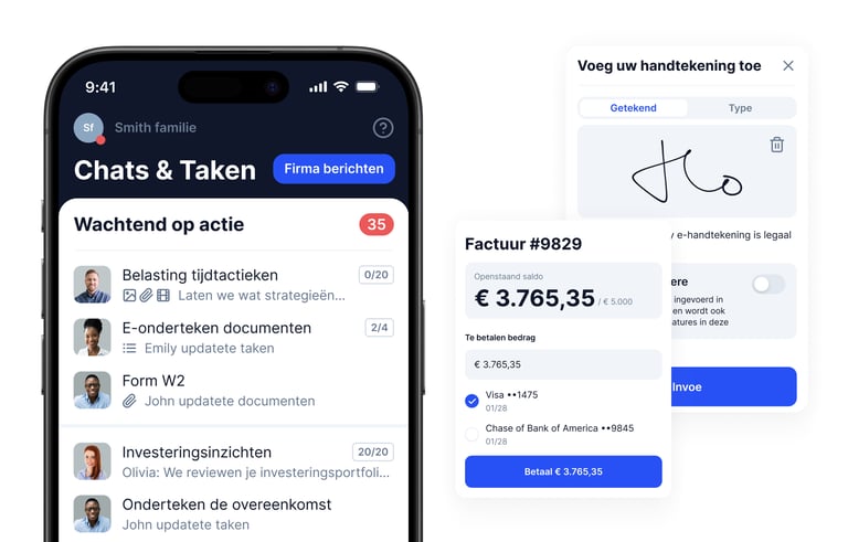 Alle contactmomenten van uw bedrijf op één naadloos portaal – uw klanten kunnen documenten indienen, met uw team chatten, facturen betalen, en meer.
