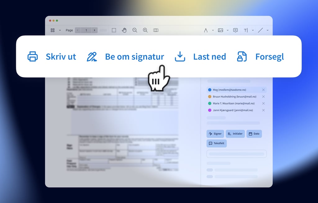 PDF-visningen holder nå de mest brukte verktøyene dine lett tilgjengelig — inkludert nedlasting, utskrift, stempel og forespørsel om signatur — slik at du kan utføre handlinger med færre klikk.