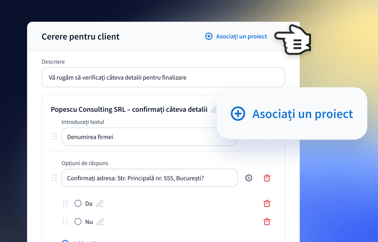 Nu mai pierdeți timp așteptând informații lipsă. Trimiteți rapid cereri, iar proiectele se actualizează automat imediat ce primiți răspunsurile de la clienți.