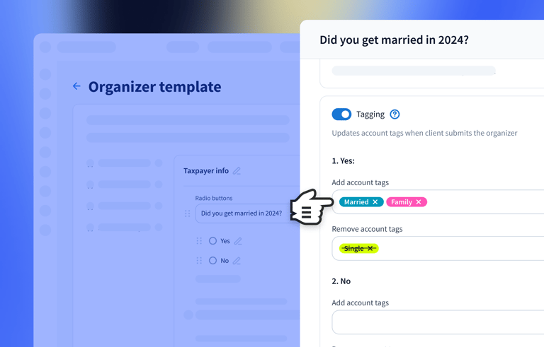Automatically assign or remove account tags based on client responses in organizers, optimizing onboarding and similar tasks.